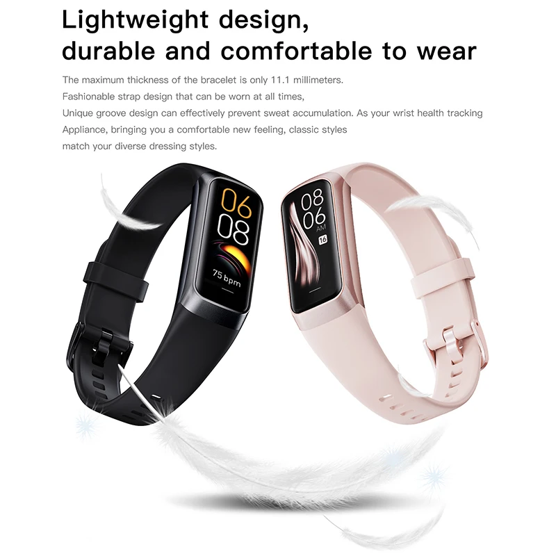 5,MULTIFUNCTIONAL ASSISTANT AND 5 ATM WATERPROOF ACTIVITY: An easy-to-use activity fitness tracker with multiple smart functions. Including call and message reminder, remote photo, drinking water reminder, sedentary reminder, women's health, family health, alarm clock, stopwatch, find device and so on. Designed according to waterproof and dustproof standard, you can wear it while washing your hands, bathing, swimming, diving or getting wet without damaging the watch.